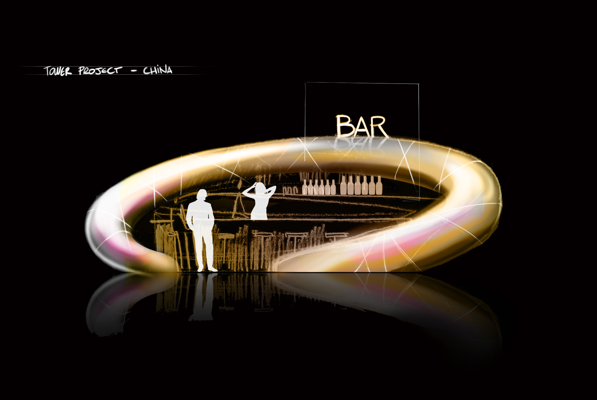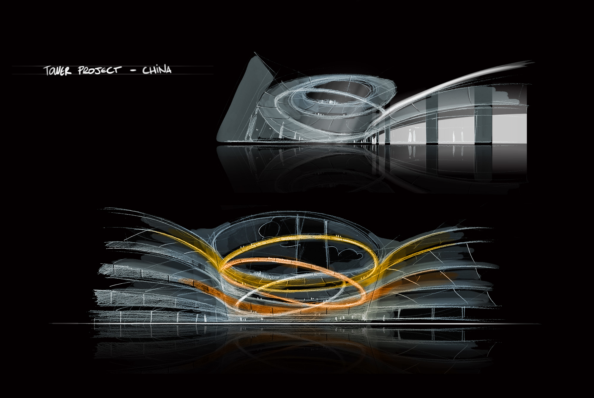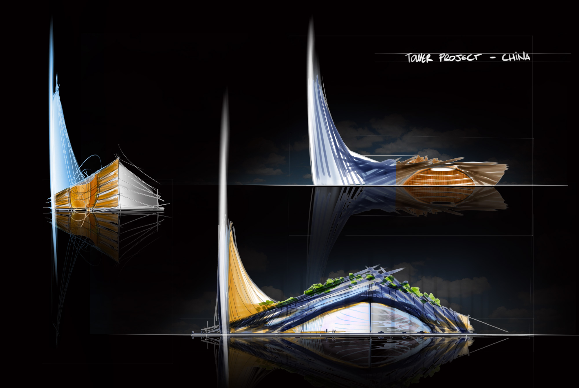Illustrations d'un concept de tour pour un grand projet architectural. Réflexions sur la rencontre du verre et du bois et sur les "trois ors" reliant les niveaux entre eux.